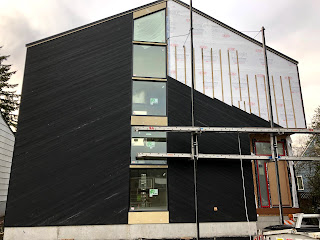 Smoking hot! During installation a bunch of sawdust and white dust got on the black cedar, which the builder is waiting until the end to wash off. Along with the black, my other splurge material was red aluminum panels to go with the red windows. (The door in the first pic is a temporary door.)